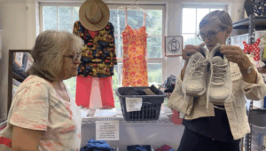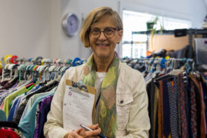 My responsibility is to assist clients as they shop for clothing, housewares, and food in the pantry. These tangible goods are things our clients need to manage their households and budgets but I receive so much more in return; smiles, hugs, occasional tears and stories that humble and inspire me: the grandmother who is raising her grandchildren after her daughter was murdered;  the single mother who was impoverished by a brutal divorce and the volunteer team all had the joy of dressing her for her first day starting a well paying new job; the mother of young children who job shares with her own mother so they can take turns caring for a beloved family member with Downs Syndrome.